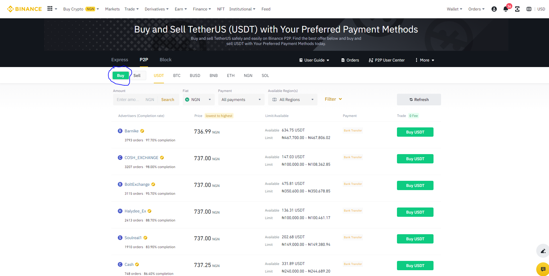 Step 2: Select the [Payment method] button in the middle. Filter the ads by selecting “Bank Transfer” in the drop-down menu. Afterwards, choose the P2P ad that suits your needs, Click on Buy USDT.